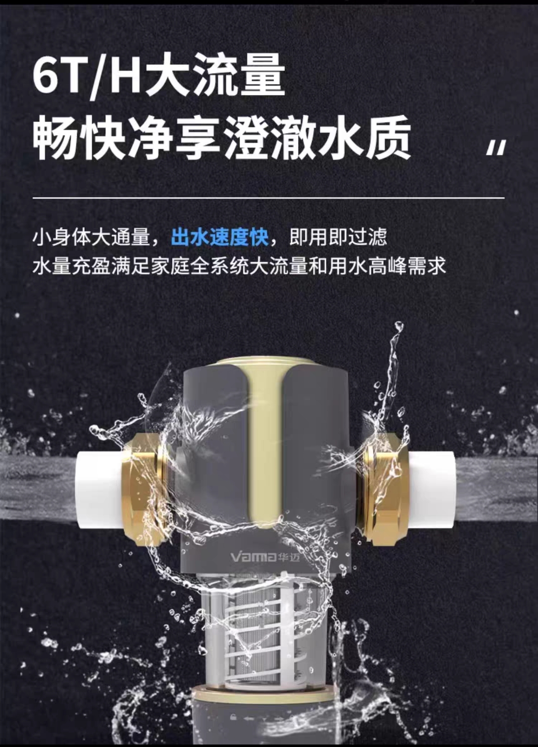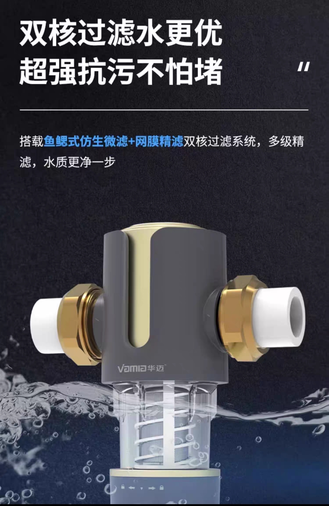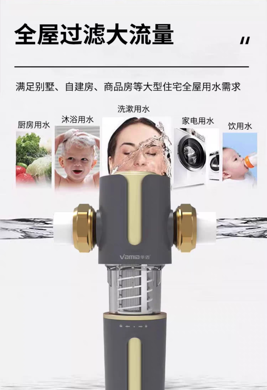 前置过滤器带反冲洗,轻松排污免拆洗,滤除大颗粒保护家电,洗脸、刷牙、洗澡洗衣服都安心,守护全屋用水第一道关。